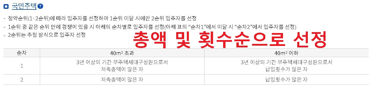 국민주택의 경우 40m 2 초과할 경우 저축총액 많은 순으로 당첨되고