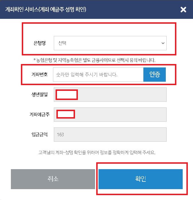 생년월일과 계좌 예금주는 미리 입력되어있다.