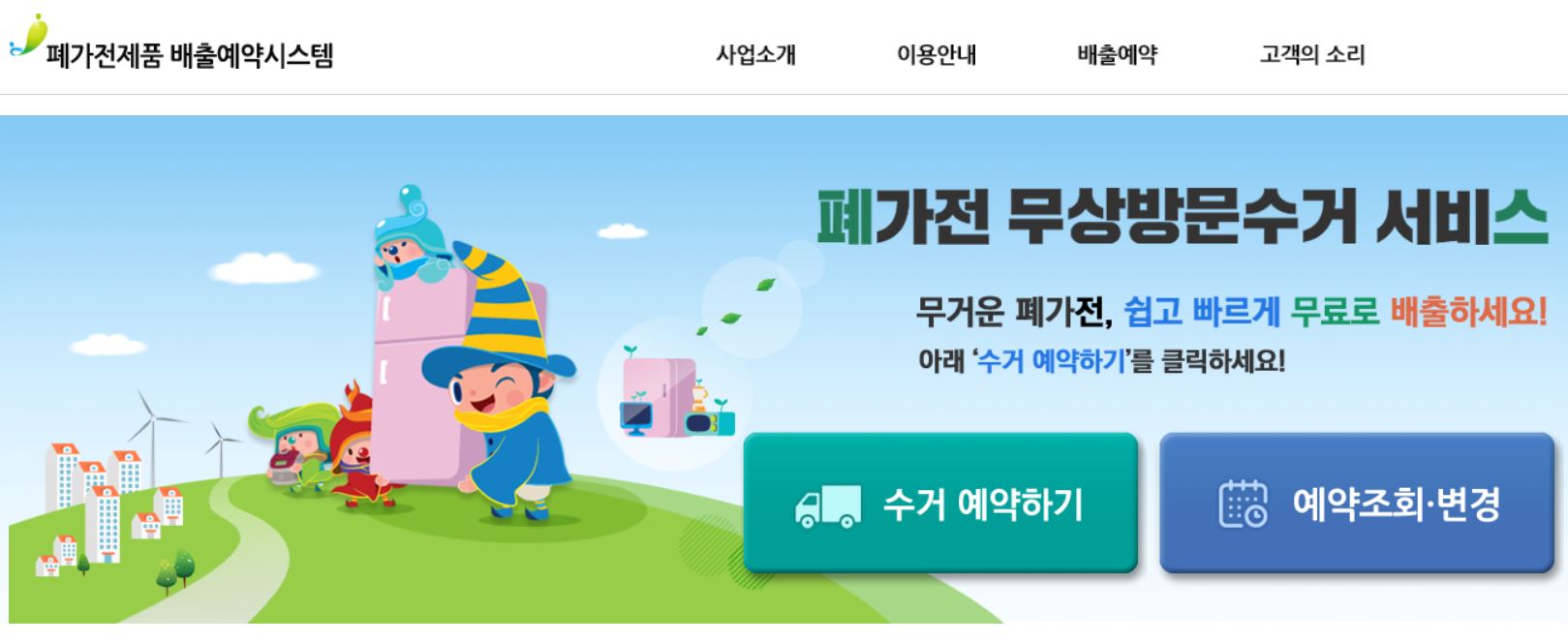 폐가전제품 배출예약시스템에서 전화나 인터넷으로 가전제품 무료 수거 신청을 하면 된다.