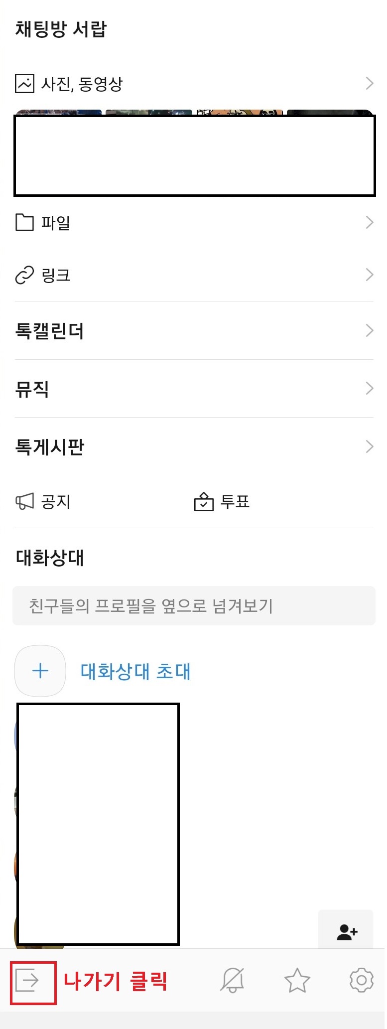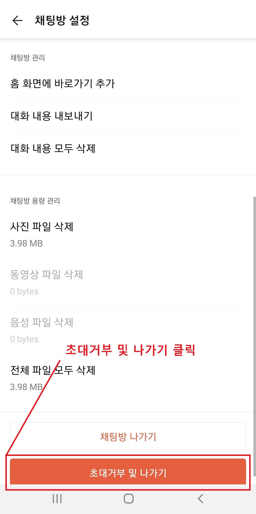 3. 채팅방 설정 페이지 하단 초대거부 및 나가기를 클릭한다.