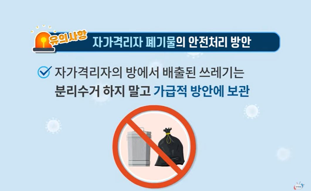 8. 격리기간 중 발생한 쓰레기는 자가격리자의 방안에 보관하다가 격리기간이 지난후 폐기물 전용봉투에 담아서 버린다.