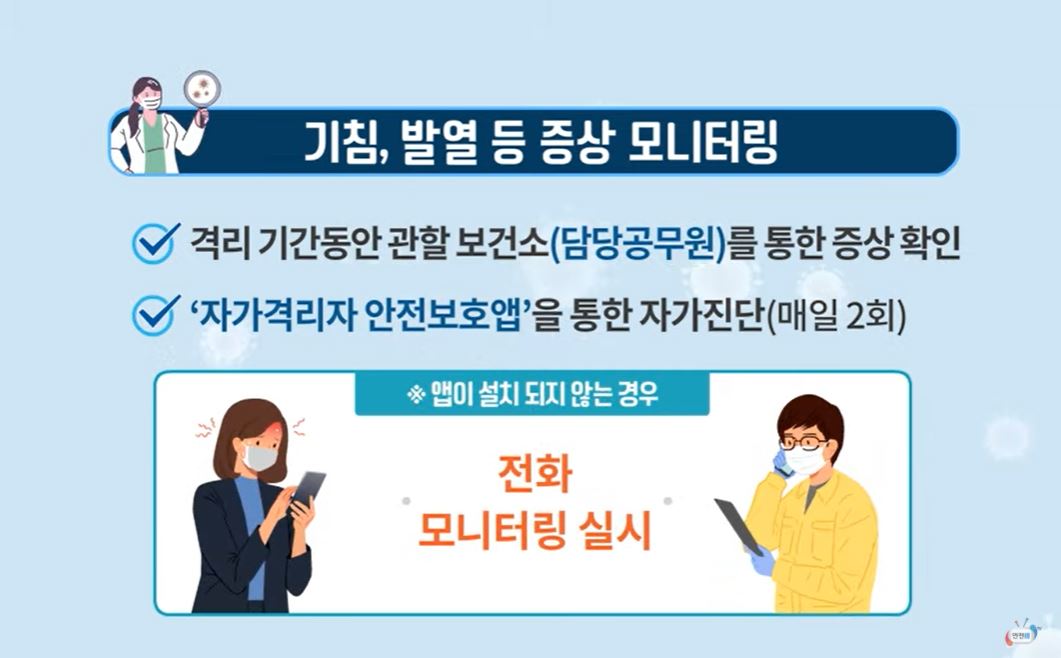 자가 격리자 안전보호 앱에 매일 2차례 입력을 해야 하고 입이 설치되지 않은 경우에는 담당공무원과 전화를 통해 확인해야 한다.