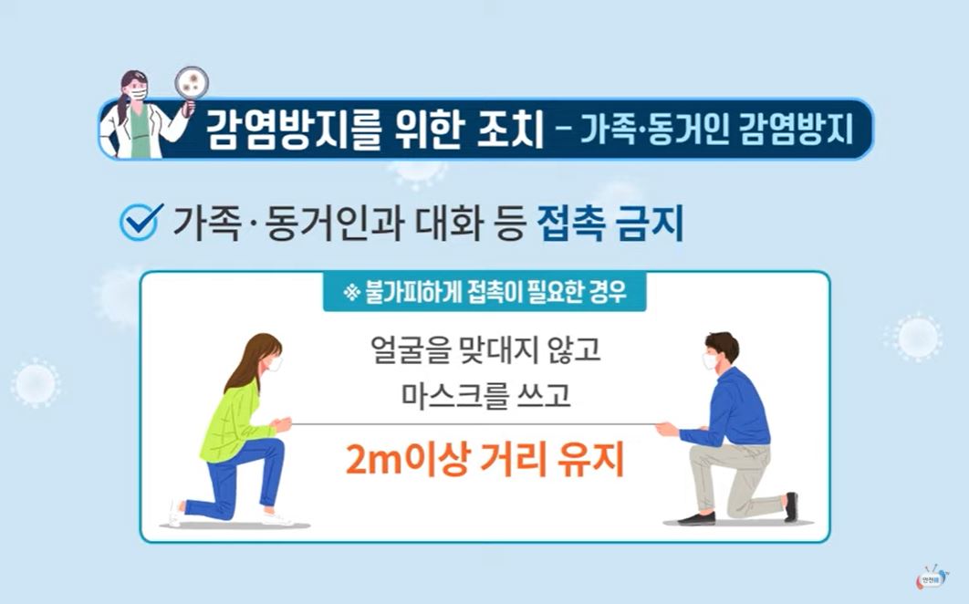 3. 불가피하게 가족 동거인과 대화할 경우에는 마스크를 쓰고 2m 이상 거리를 두어야 한다.