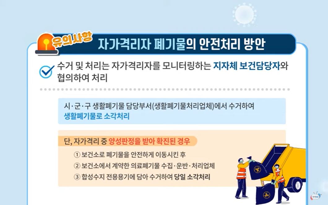 9. 불가피하게 격리기간중 쓰레기를 버려야 하는 경우라면 쓰레기를 소독한 후 폐기물 전용봉투에 담아 밀봉한 후 다시 종량제 봉투에 넣은 후 보건소에 연락하여 협의 후 처리한다.