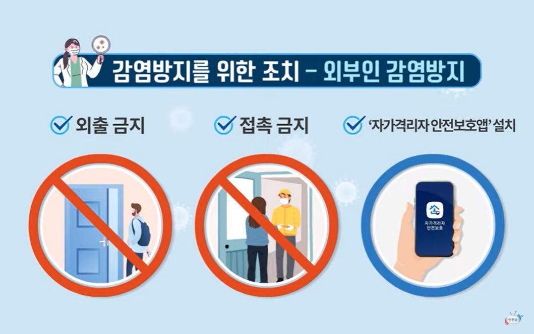 자가격리는 타인에게 감염되지 않도록 하기 위한 것이므로 각별한 주의가 필요하다.