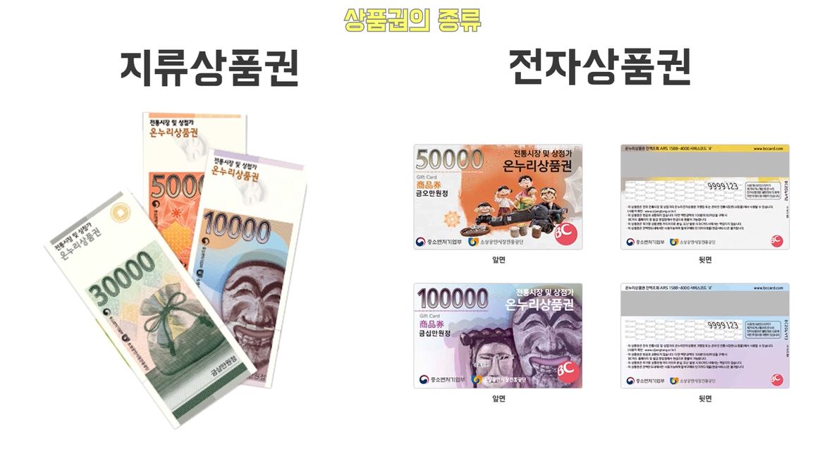 온누리 상품권 지류 상품권 전자상품권 모바일 상품권 3종류가 있다.
