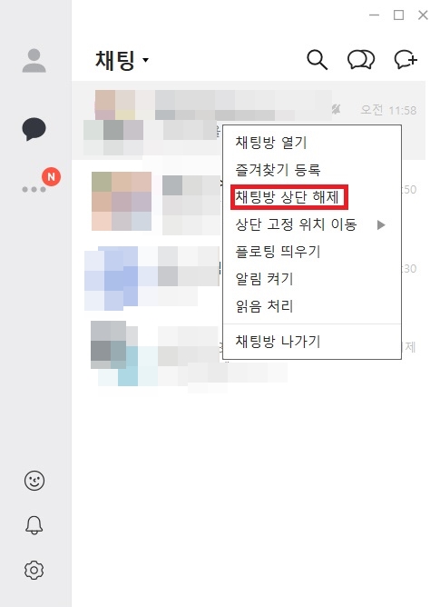 채팅방 아이콘을 클릭하면 새로운 창이 나타나는데 채팅방 상단고정 해제를 클릭하면 된다.