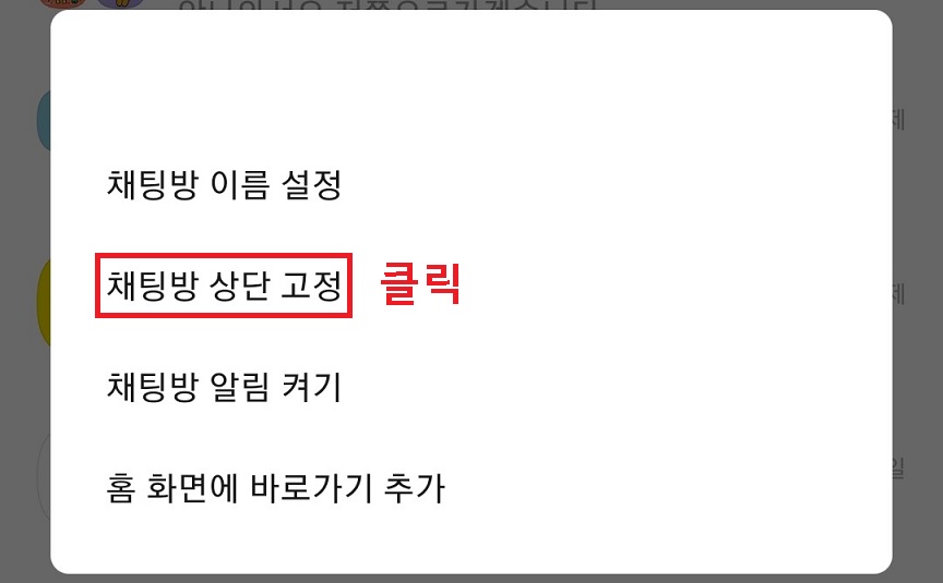 2. 그럼 선택할 수 있는 창이 뜨는데 3번째 채팅방 상단 고정을 클릭하면 된다.