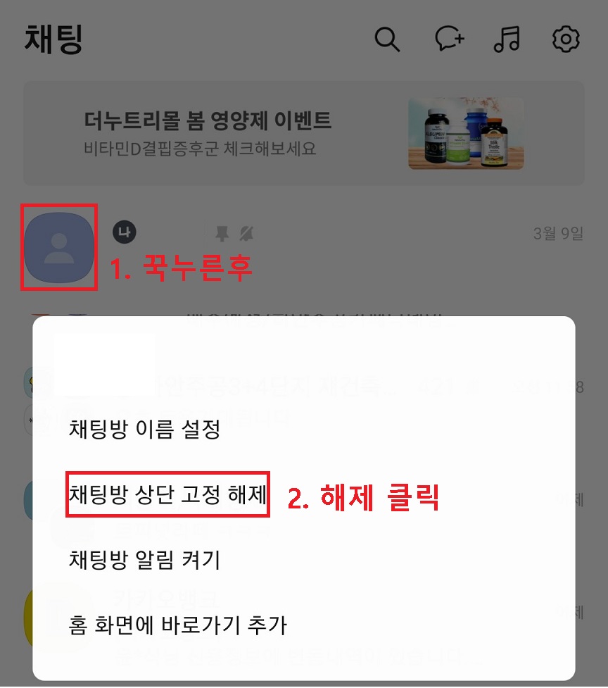그럼 카톡 채팅방 상단고정을 해제하고 싶다면?
