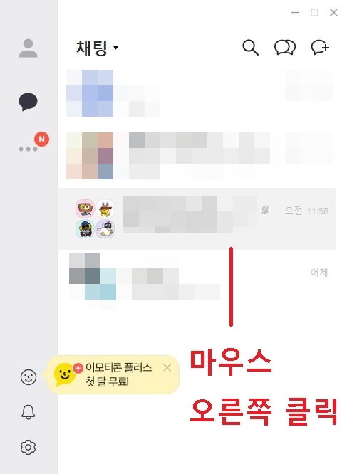 1. PC 카톡 채팅창에서 원하는 채팅방에 마우스를 대고 마우스 오른쪽 버튼을 클릭 한다.