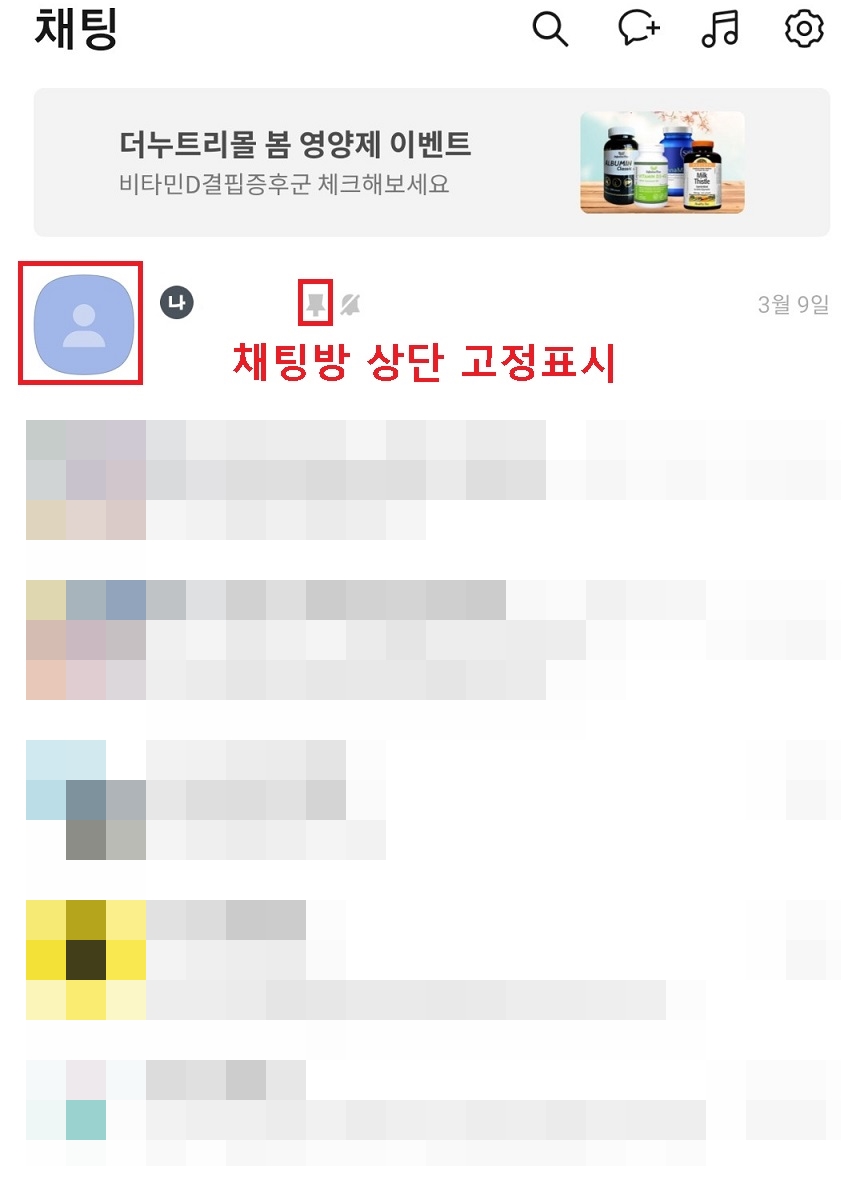 카톡 채팅방 상단 고정을 하면 고정표시 아이콘(사진표시)이 생긴다.