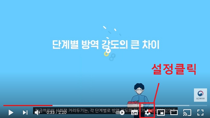 1. 유튜브 동영상 화면을 마우스로 클릭하면 하단에 톱니바퀴 모양의 설정이 보이는데 클릭한다.