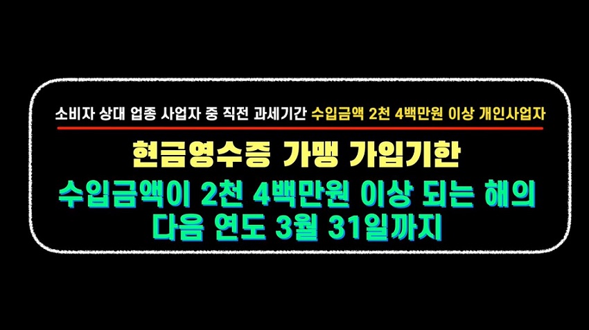 소비자 상대 개인 사업자는 직전 연도 매출이 2,400만 원 된다면 3월 31일까지 현금영수증 가맹점 가입해야 한다.