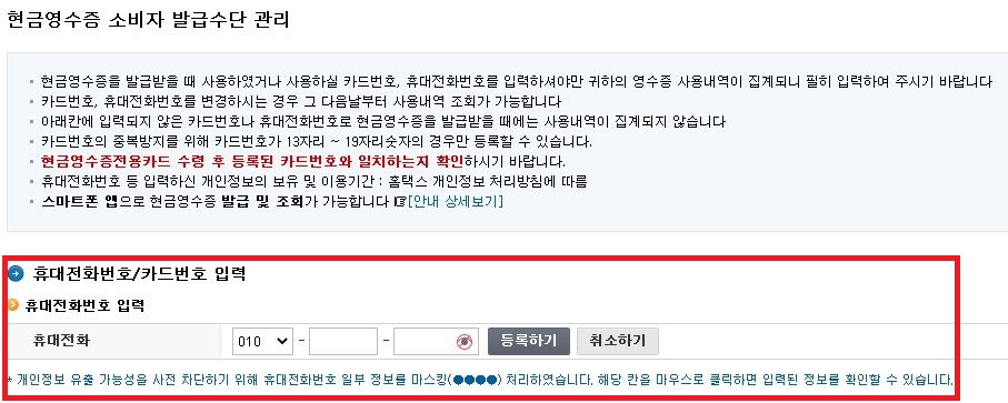 4. 현금영수증 소비자 발급수단 관리 페이지에서 상단에 휴대전화 번호 입력을 하고 등록하기를 누르면 된다.
