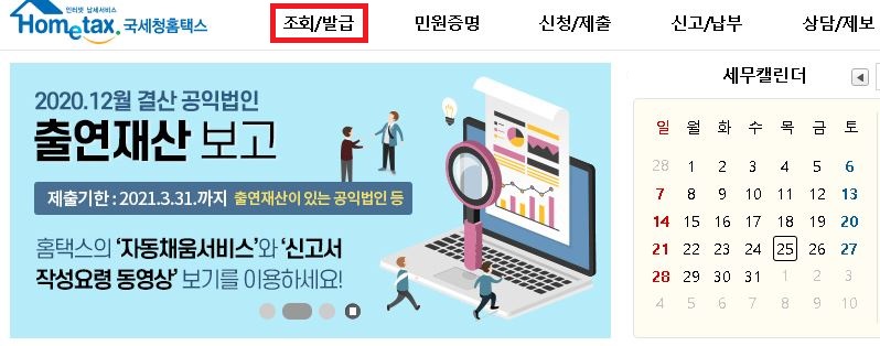 1. 국세청 홈택스에 접속해서 상단 조회/발급 메뉴를 클릭한다.