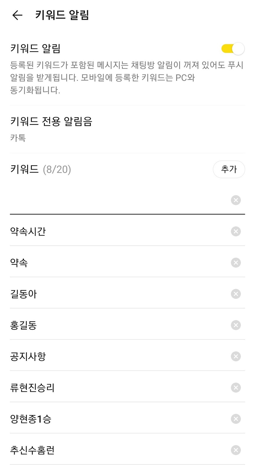 총 8개인데 이제 이 단어가 채팅방에서 언급될 때마다 카톡 키워드 알림 기능이 작동해 알림이 온다.