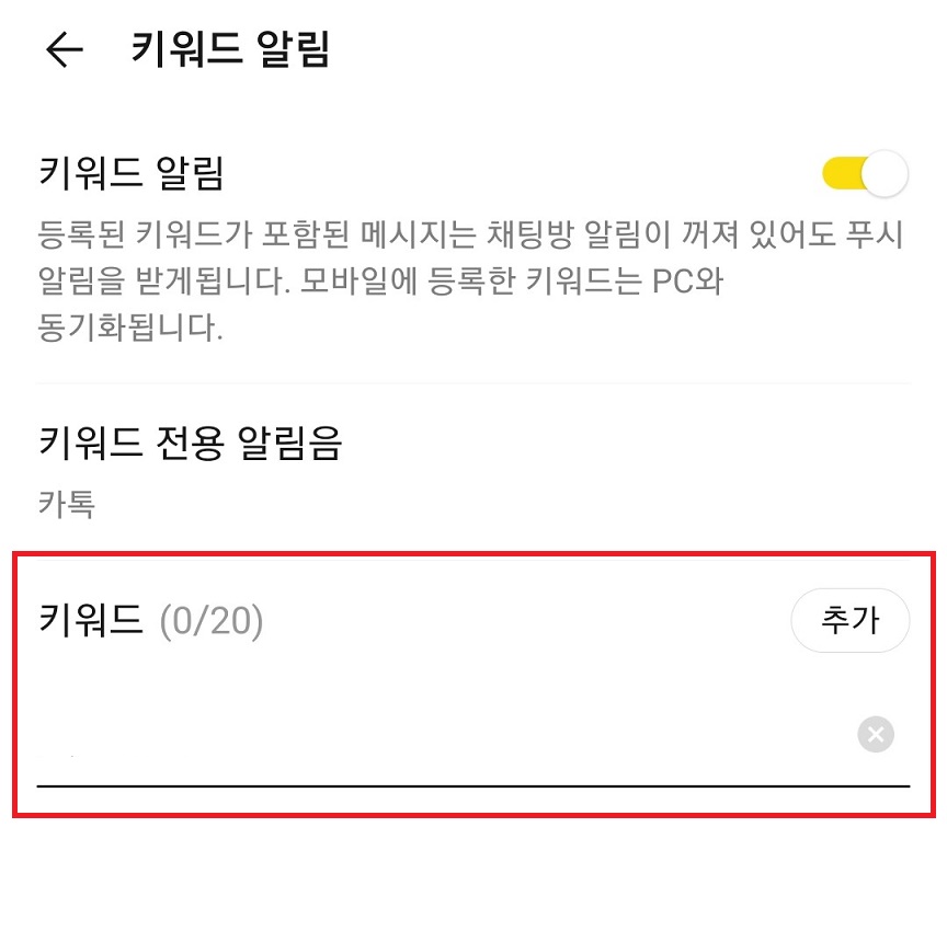 5. 카톡 키워드 알림 버튼이 노란색으로 변했다.