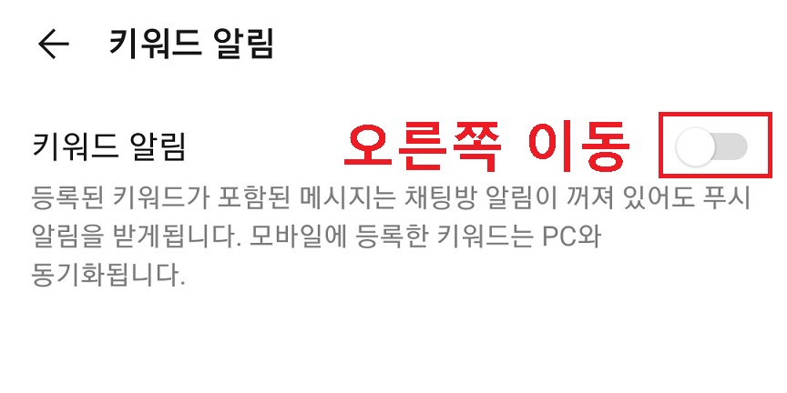 4. 카톡 키워드 알림 버튼을 오른쪽으로 이동시킨다.