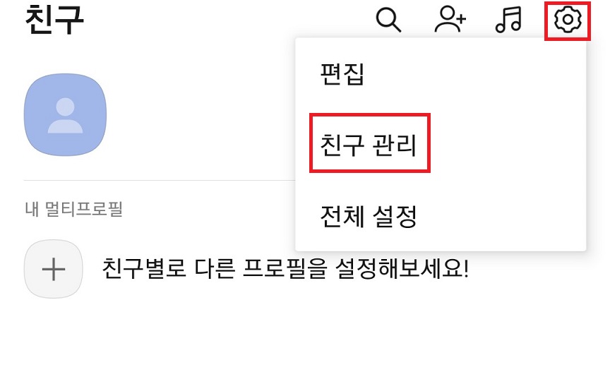 친구 페이지에서 상단 톱니바퀴 모양 설정을 누른 후 친구 관리를 클릭한다.