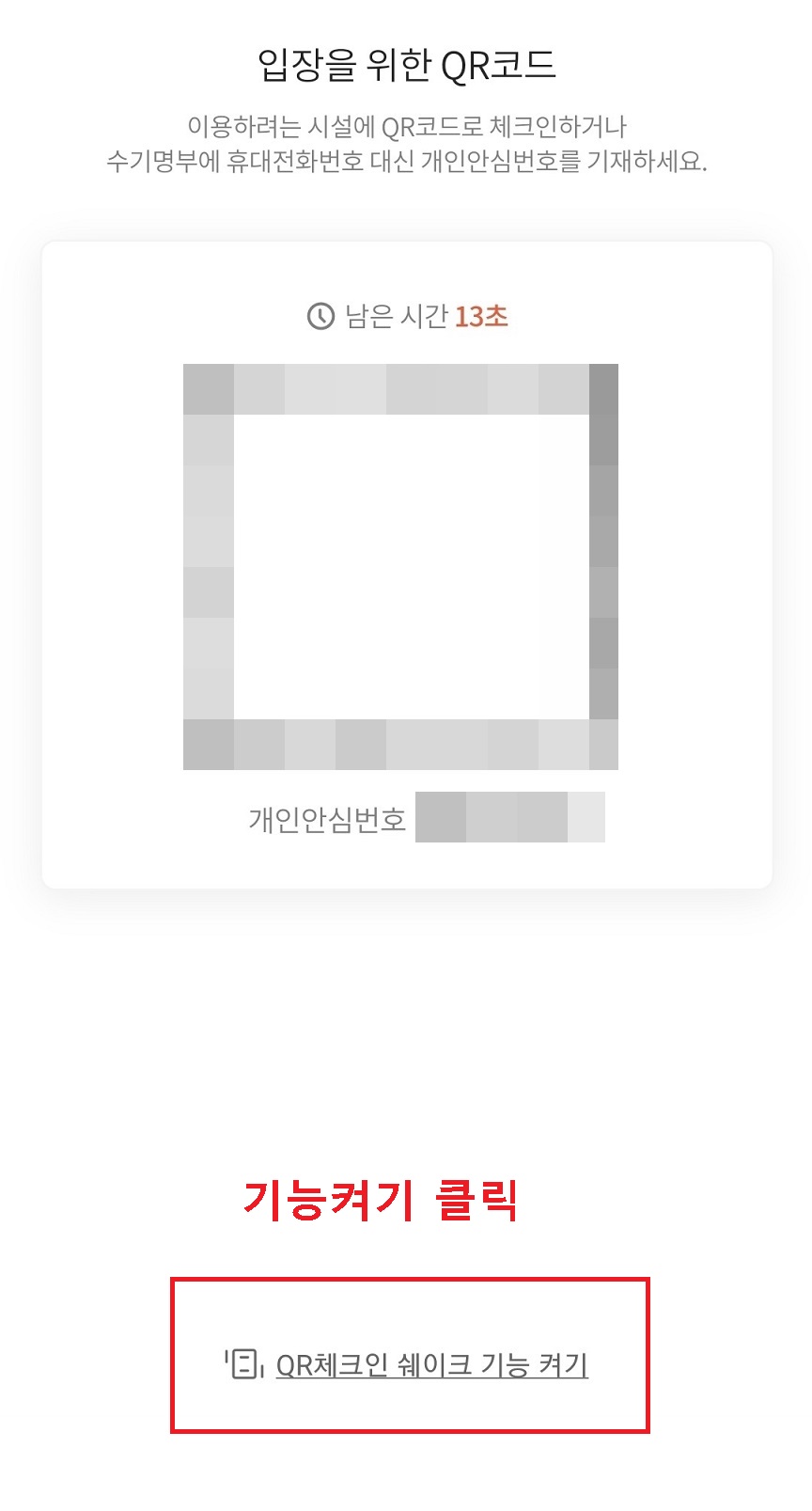 2. QR 코드 페이지 하단에 QR 체크인 쉐이크 기능 켜기를 클릭한다.