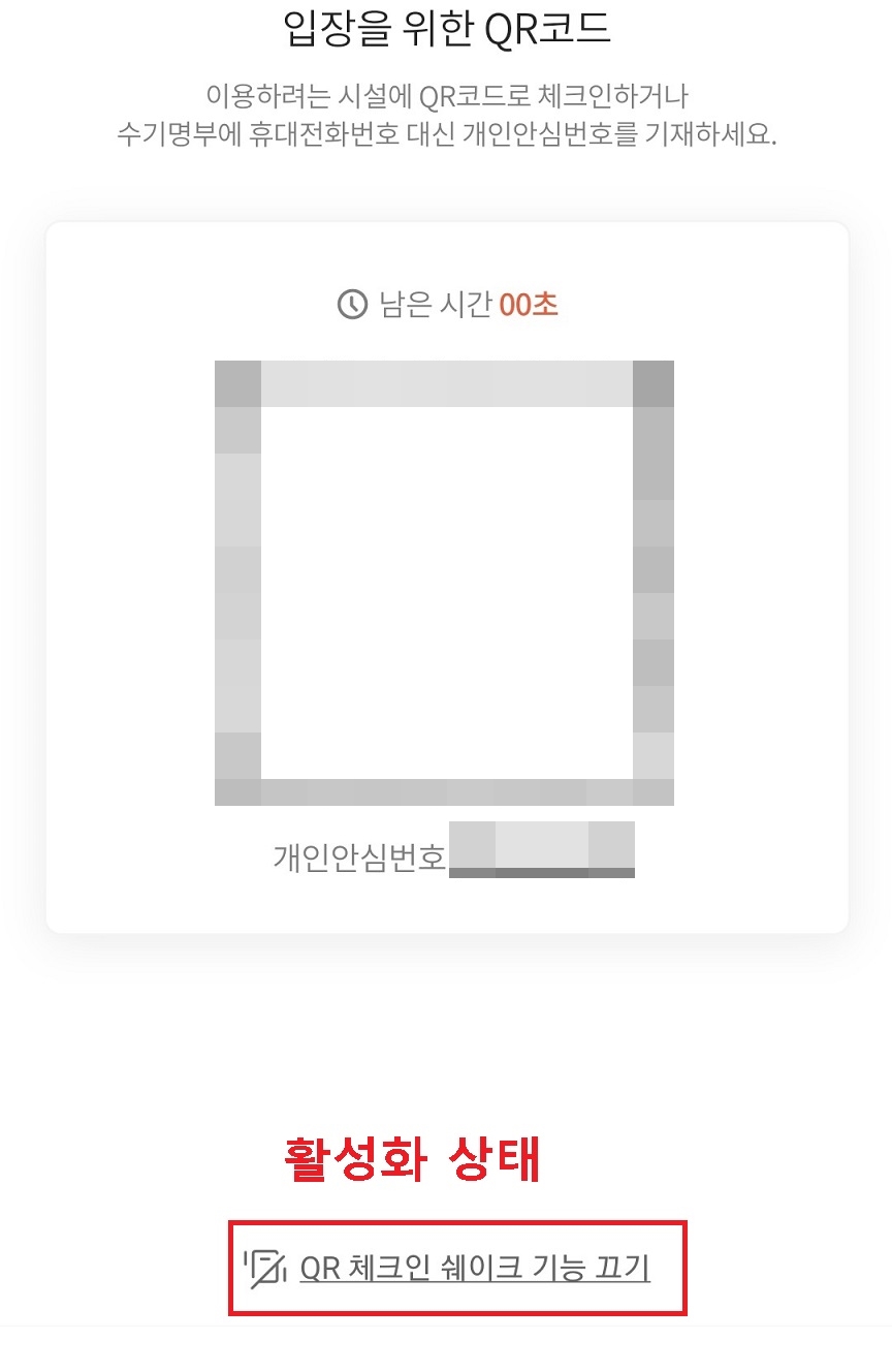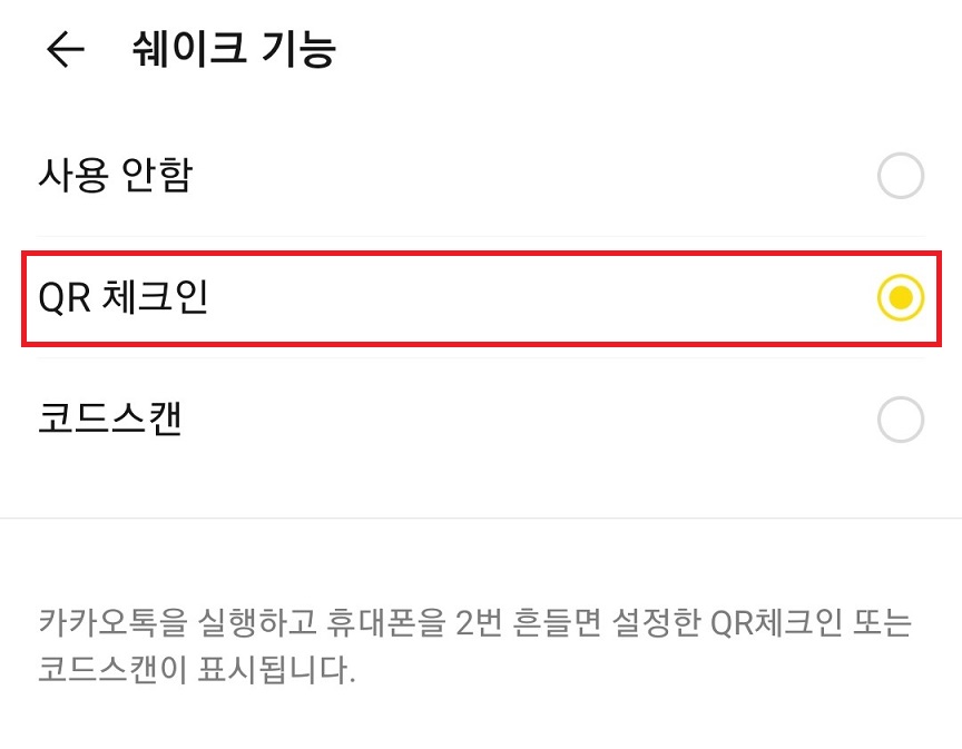 QR 체크인 쉐이크 기능 끄기라고 되어있으면 카톡 QR(큐알) 코드 흔들기가 작동하는 것이다.