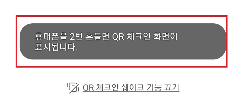 3. 카톡 QR(큐알) 코드 흔들기 기능이 활성화되면서 아래 사진과 같이 휴대폰을 2번 흔들면 QR체크인 화면이 표시됩니다 라는 메시지가 뜬다.