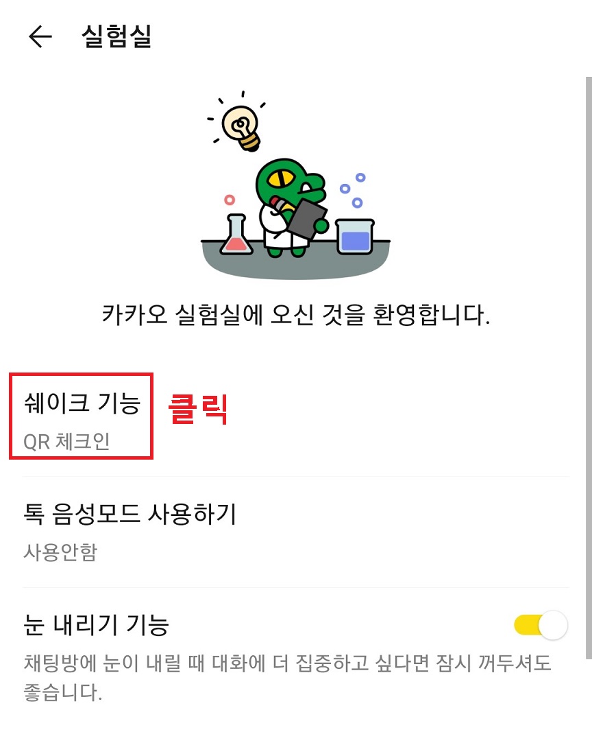 이번에는 실험실 메뉴에서 카톡 QR(큐알)코드 흔들기 설정하는 방법을 알아보겠다.