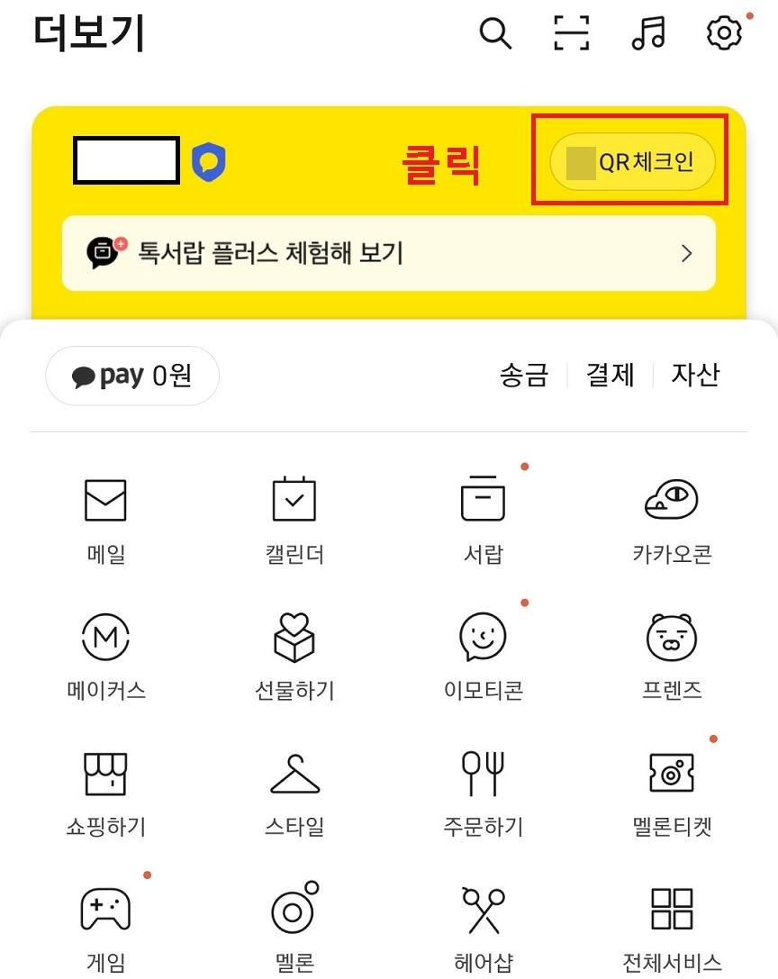 1. 카카오톡 더보기 페이지에서 QR 체크인을 클릭한다.