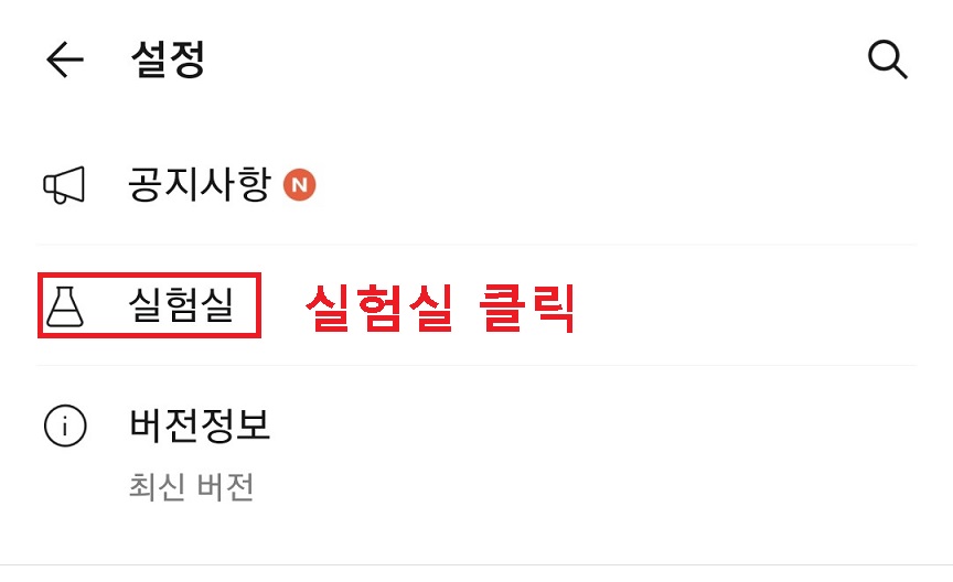 2. 설정에서 실험실을 클릭한다.