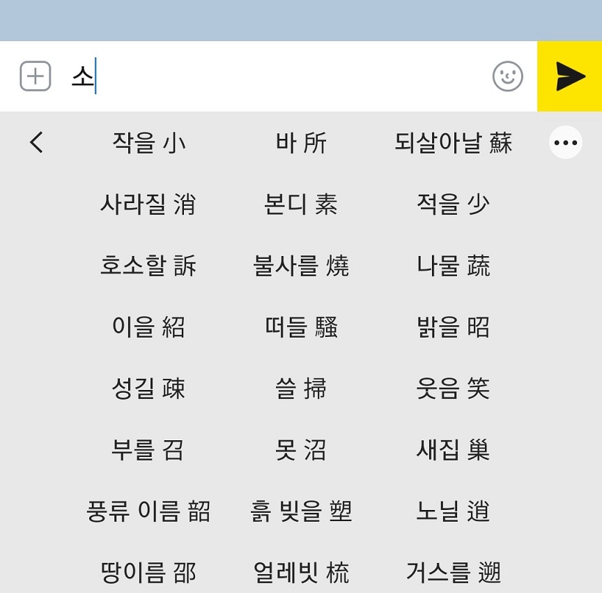 '소' 라는 글자를 채팅창에 입력 후 한자 버튼을 클릭한다.