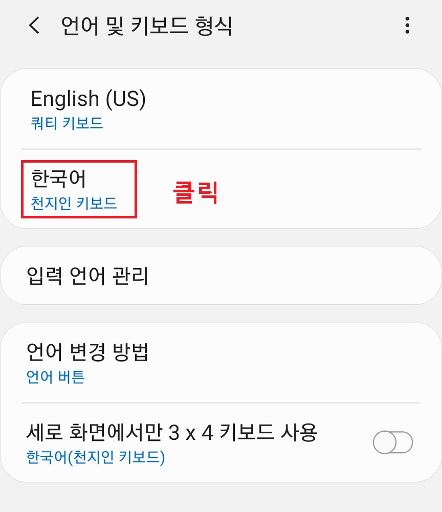 나는 현재 천지인 키보드로 설정되어 있어서 아래에 천지인 키보드라고 되어있다.