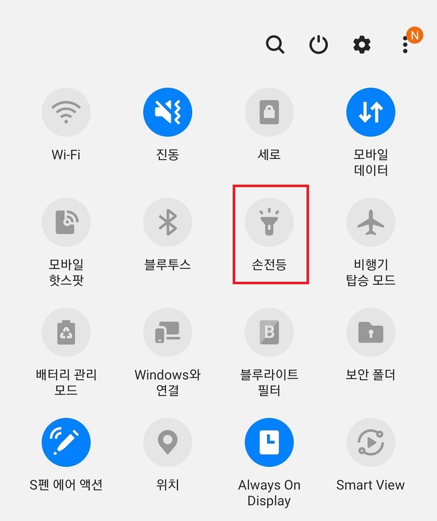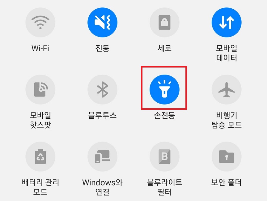 아래 사진처럼 휴대폰 아이콘이 활성화되면서 갤럭시 스마트폰 손전등이 켜진다.