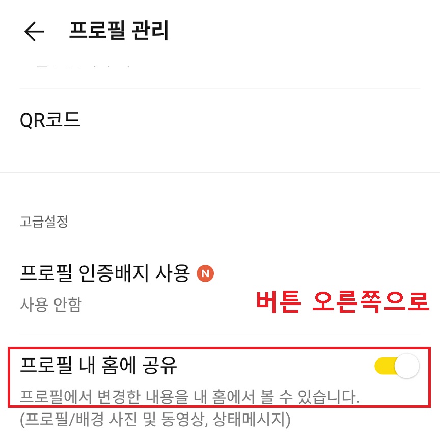 2. 프로필 관리 페이지에서 '프로필 내 홈에 공유' 버튼을 오른쪽으로 옮긴다.