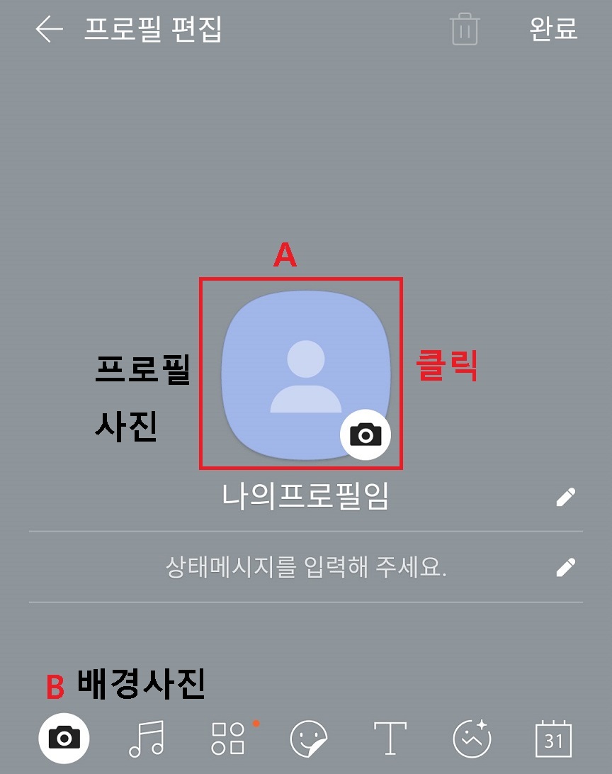 카톡 프로필 사진 올리기를 하려면 A부분을 클릭해야 한다.