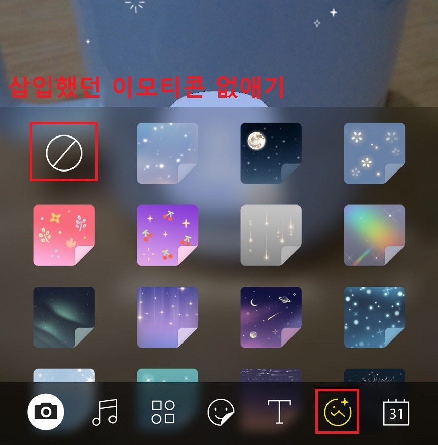 좌측 상단 투표도장 모양의 표시는 삽입했던 이모티콘 삭제하는 기능이다.