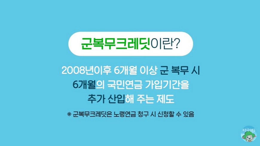 2008년 1월 1일 이후 병역의무를 이행한 자에게 6개월 국민연금 가입기간을 추가해주는 제도이다.
