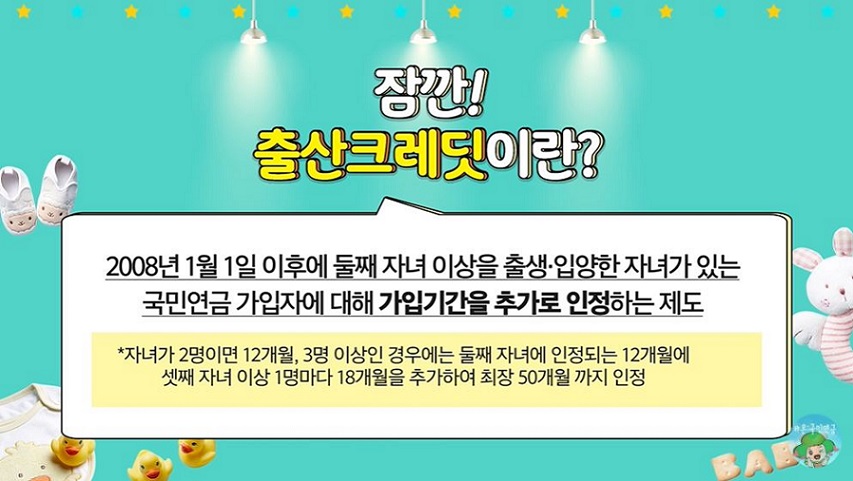 다섯째부터는 50개월 추가로 국민연금 출산 크레딧 제도 혜택을 볼 수 있다.