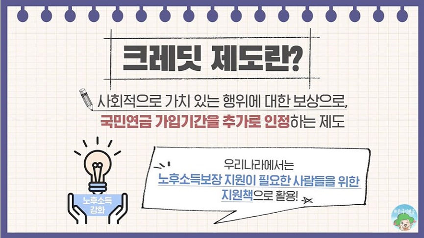 국민연금 크레딧 제도는 사회적으로 가치 있는 일을 한경우 그에 대한 보상으로 국민연금 가입기간을 추가해주는 것이다.