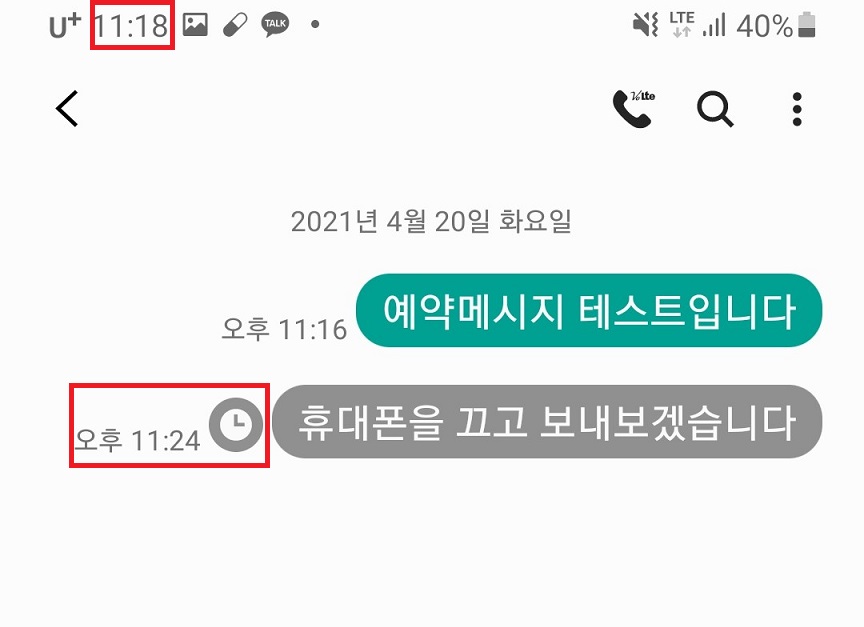테스트 결과는 핸드폰 전원이 켜져 있어야 예약 메시지 보내는 방법이 가능하다 이다.