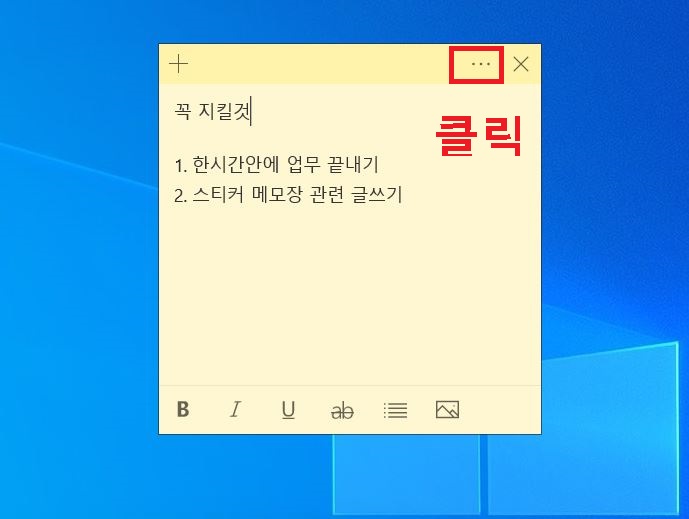 컴퓨터 바탕화면 스티커 메모장 좌측 상단에 플러스 버튼을 클릭하면 메모장 하나가 더 생긴다