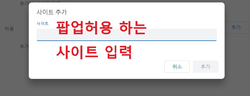 8. 그럼 사이트 추가창이 뜨는데 여기에 크롬 팝업 허용하려는 사이트를 입력한다.