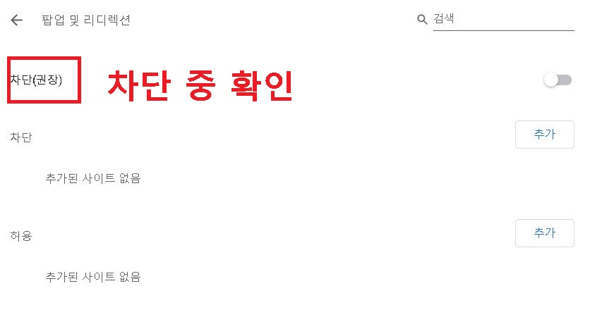 6. 먼저 팝업 및 리디렉션에서 팝업차단 상태인 것을 확인한다.