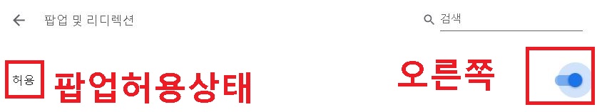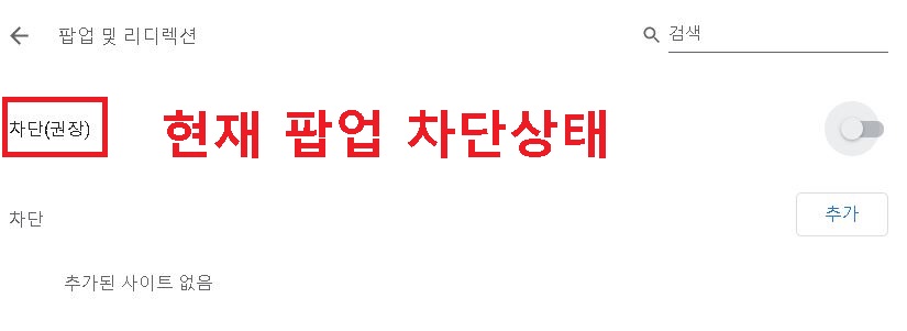 아래 사진처럼 차단이라고 되어있으면 현재 크롬 팝업 차단 상태이다.