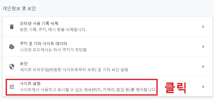 3. 개인정보 및 보안에서 사이트 설정을 클릭한다.