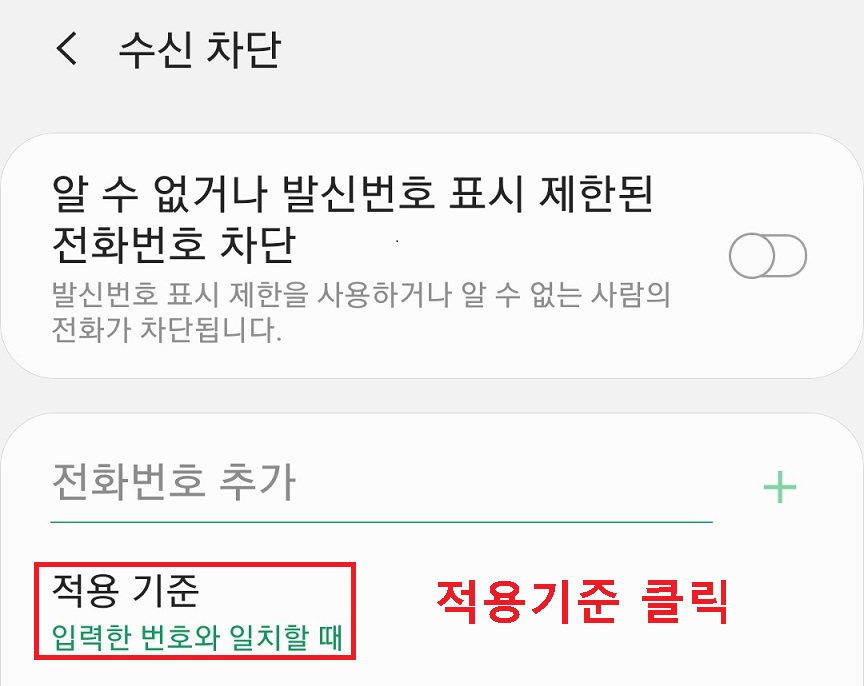 4. 수신차단 페이지에서 전화번호 추가 밑 적용기준을 클릭한다.