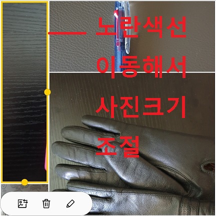 8. 사진을 터치하면 사진 주위로 노란색 선이 생기는데 이선을 이동시키면서 사진 크기 조절이 가능하다.