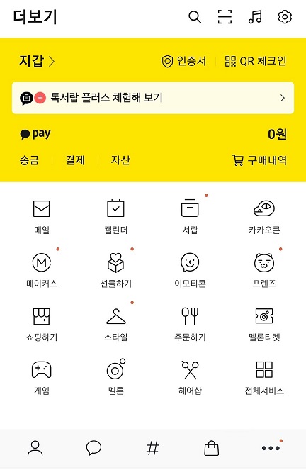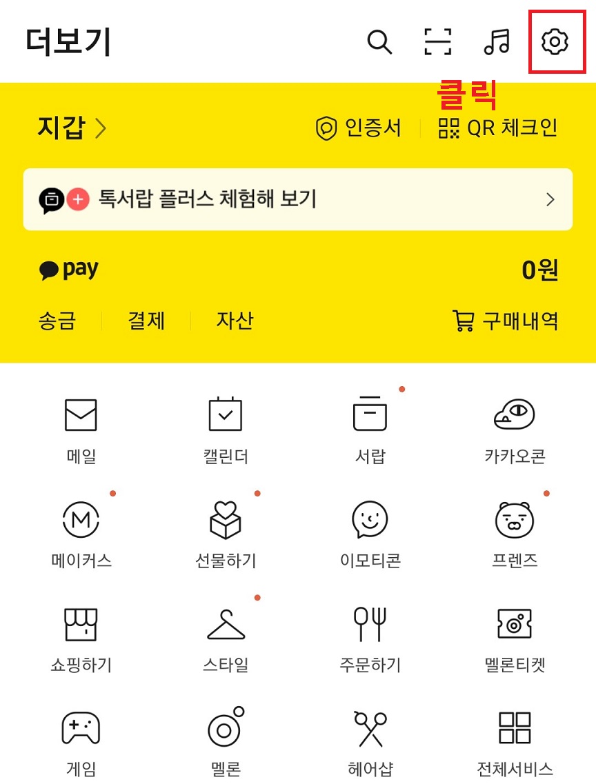 1. 카카오톡 더보기에서 톱니바퀴 모양을 클릭한다.
