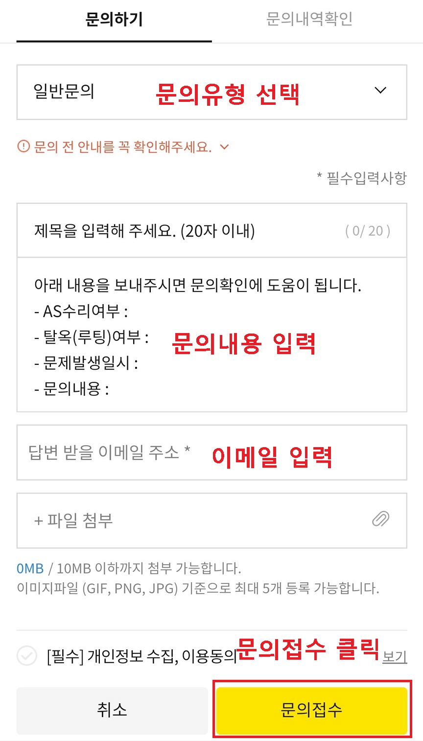 5. 문의 내용 작성 후 하단 문의 접수하기를 클릭한다.