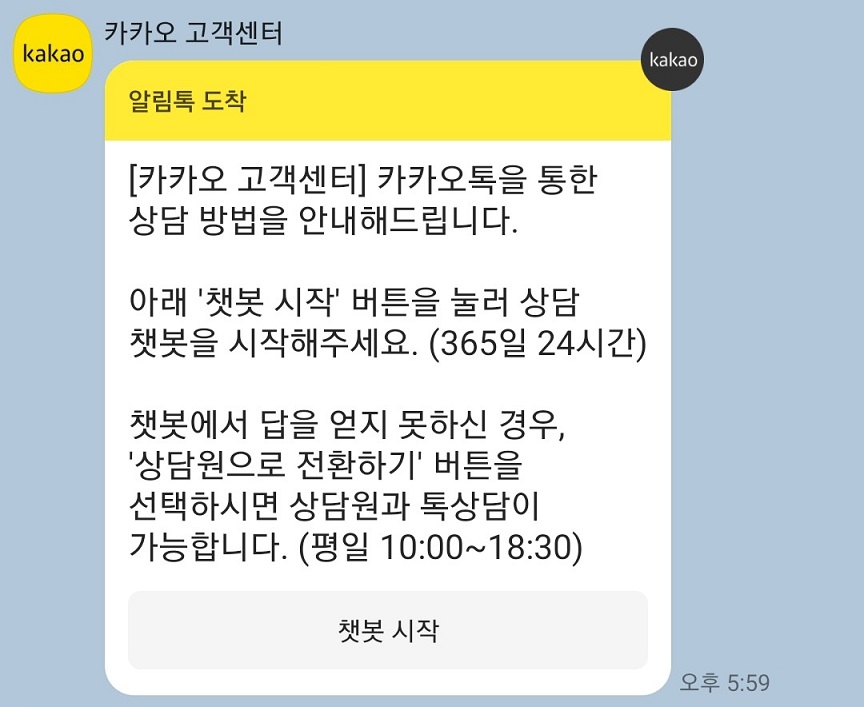 챗봇 상담은 상담원이 아닌 로봇이 카카오톡 고객센터 상담을 해주는 것이다.
