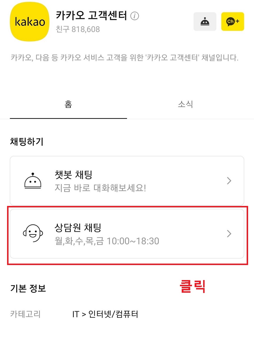 이번에는 챗봇 말고 실제 카카오톡 고객센터 상담원에게 문의하는 법을 알아보겠다.
